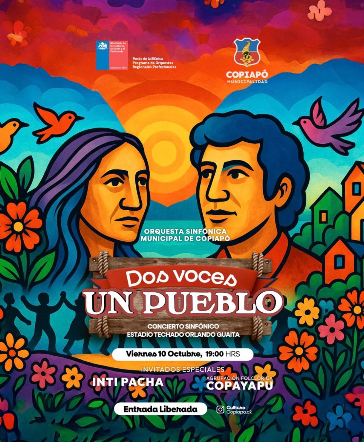 El espectáculo conmemora el Día de la Música Chilena rindiendo homenaje a Violeta Parra y Víctor Jara, dos figuras icónicas cuya obra ha trascendido generaciones, manteniendo vivo el espíritu y la identidad del pueblo chileno. La propuesta artística reunirá en un mismo escenario a la Orquesta Sinfónica Municipal de Copiapó, la Banda IntiPacha y la Agrupación Folclórica Copayapú, ofreciendo una experiencia que combina música, danza e identidad cultural.